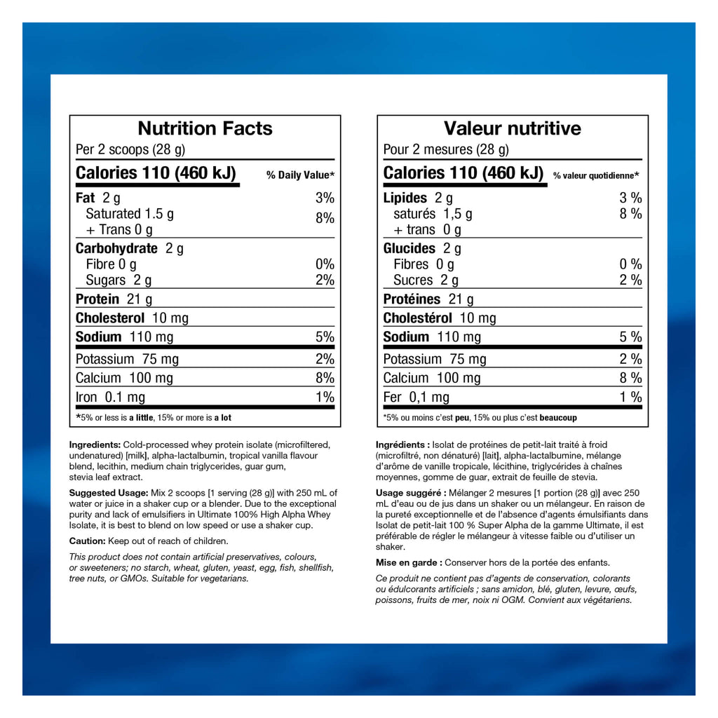 | Medicinal Ingredients: Cold-processed whey protein isolate (microfiltered, undenatured) [milk], alpha-lactalbumin, tropical vanilla flavour blend, lecithin, medium chain triglycerides, guar gum, stevia leaf extract. | |||