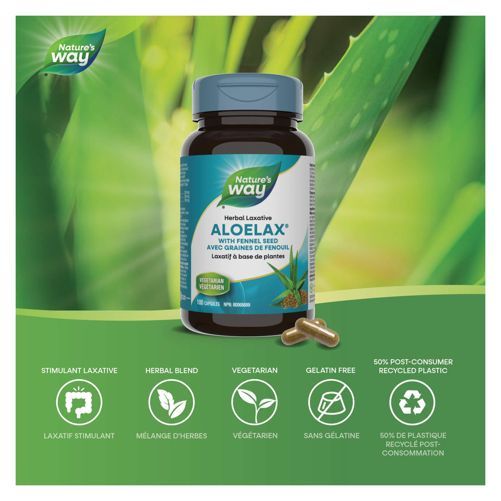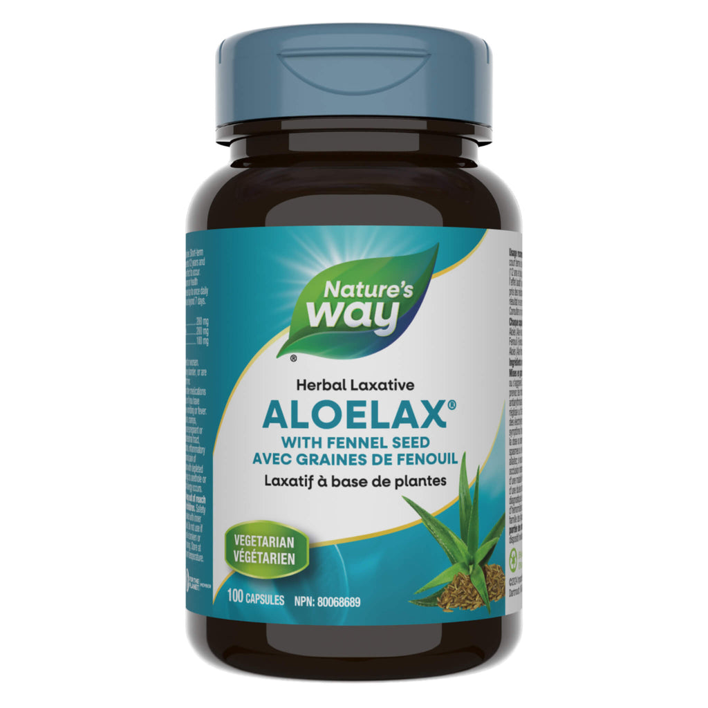 Nature's Way Aloelax is proprietary blend of aloe vera and fennel seed and acts as an herbal stimulant. Aloe vera is sourced from both the latex and leaf gel parts of the plant. Nature's Way Aloelax is Vegetarian.