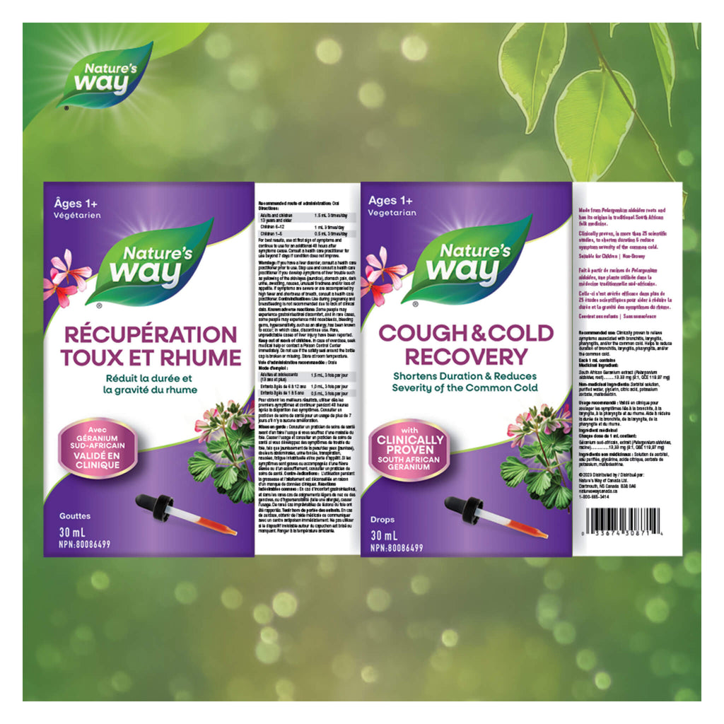 Nature's Way Cough & Cold Recovery is made from a proprietary extract of Pelargonium sidoides (South African Geranium) root. It is clinically proven, in more than 25 scientific studies,to relieve symptoms associated with the common cold. Nature's Way Cough & Cold Recovery is non-drowsy and is suitable for children.