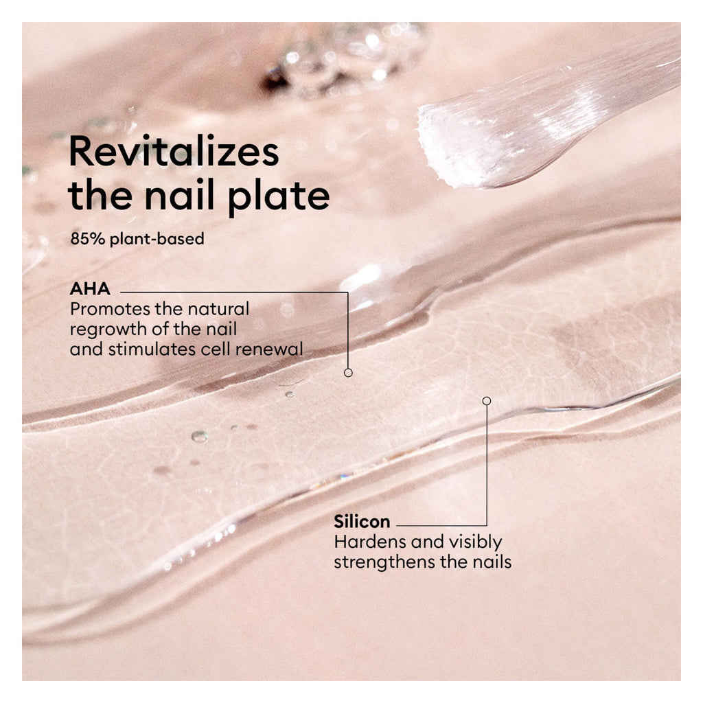 The Strengthening Base is a fortifying polish enriched with AHAs, PHAs, and silica to strengthen nails from within and create a protective shield resistant to daily impacts.
