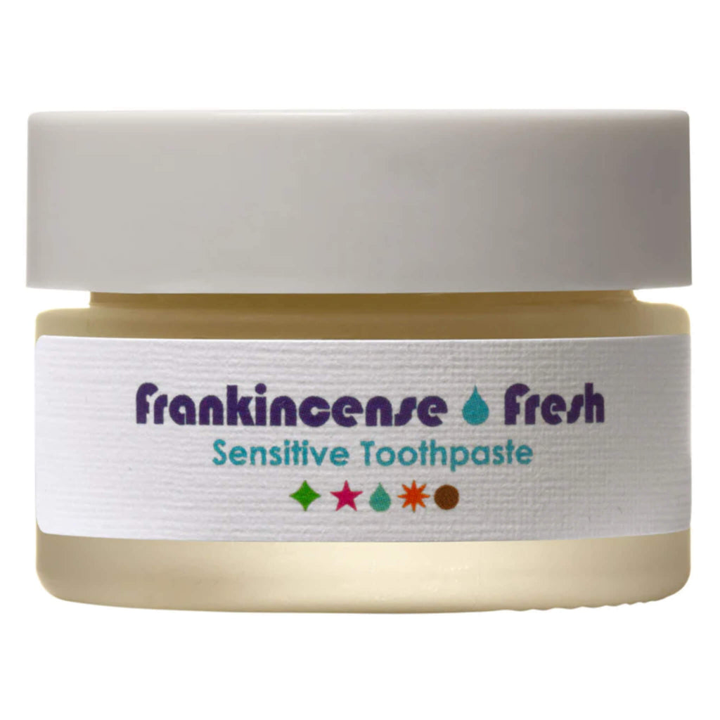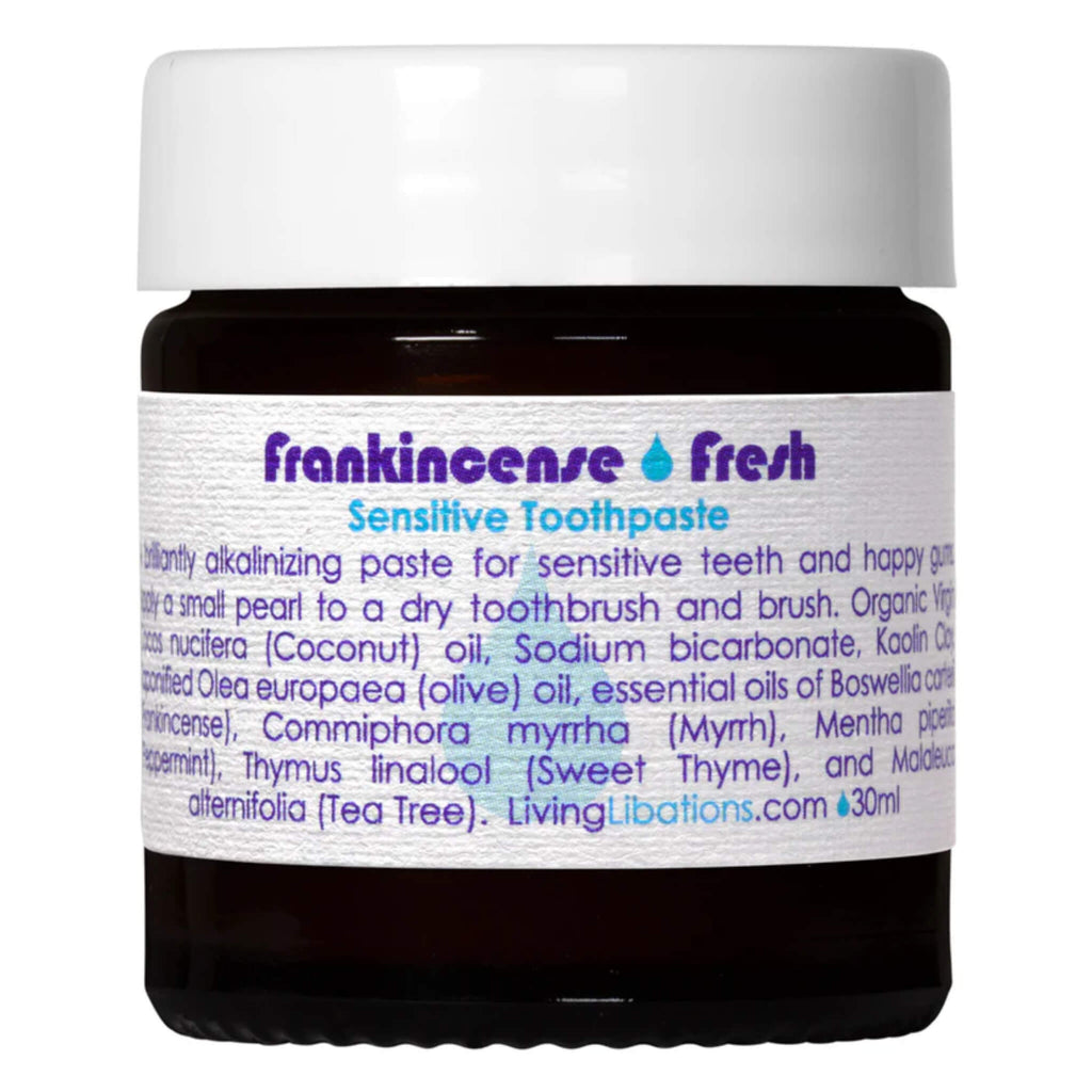 Living Libations Frankincense Fresh Sensitive Toothpaste is a brilliantly alkalinizing paste for smooth, shiny teeth and the freshest breath. Apply a small pearl size to a dry toothbrush and brush. Pearly, clean teeth, fresh-all-day breath, and sweet saliva await you.
