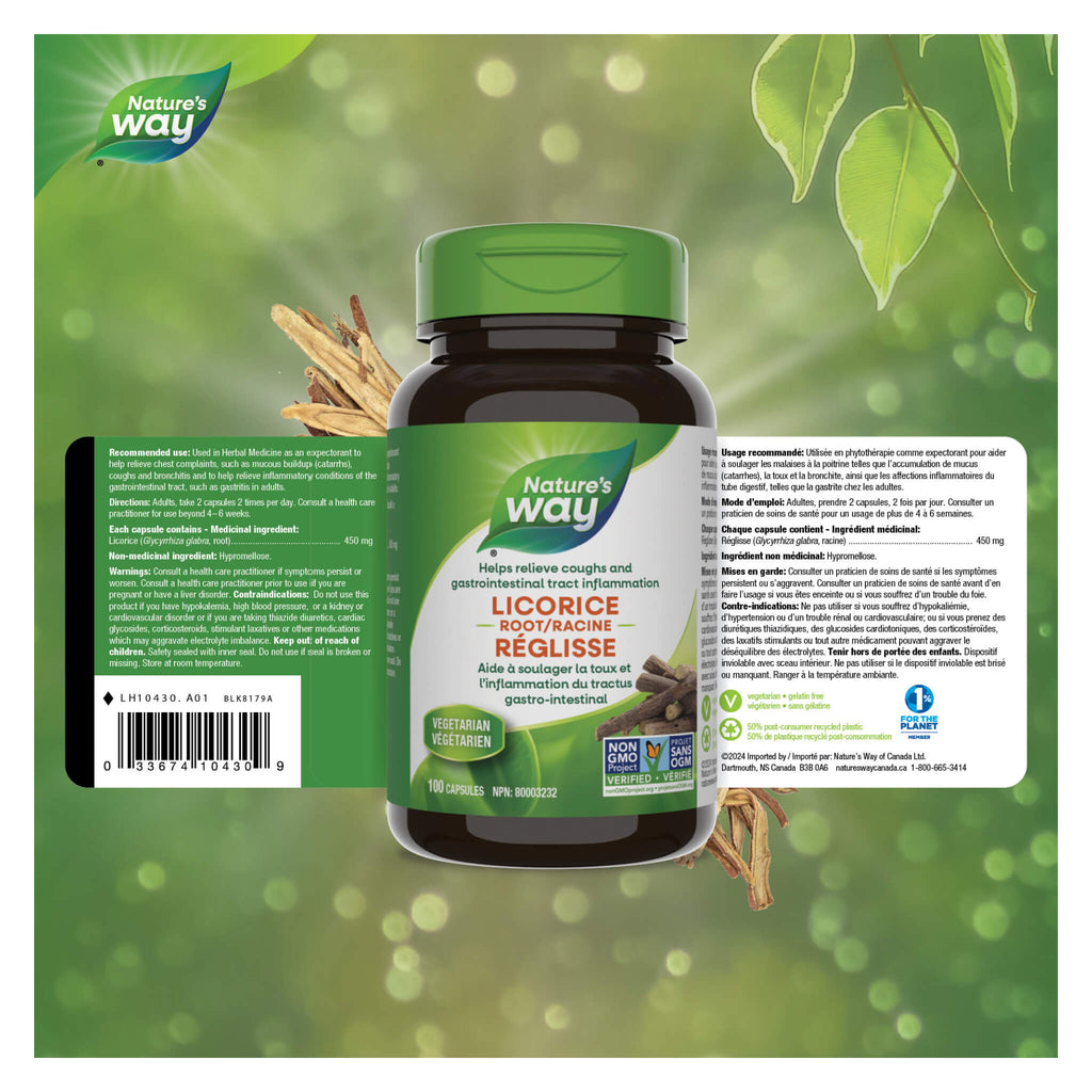 Nature's Way Licorice Root is traditionally used in Herbal Medicine as an expectorant to help relieve chest complaints, such as mucous buildup (catarrhs), coughs and bronchitis and to help relieve inflammatory conditions of the gastorintestinal tract, such as gastritis in adults.