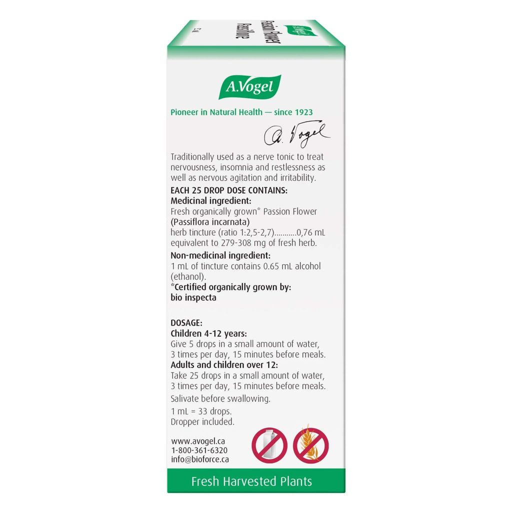 | Fresh organically grown* Passion Flower (Passiflora incarnata) herb tincture (ratio 1:2,5-2,7) | 0,76 mL equivalent to 279-308 mg of fresh herb. | |