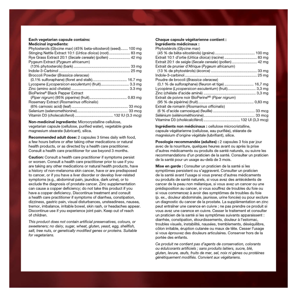 Cautions & Warnings: Consult a health care practitioner if symptoms persist or worsen. Consult a health care practitioner prior to use if you are taking any other medications or natural health products, have a history of non-melanoma skin cancer, have or are predisposed to cancer, or if you have a liver disorder or develop liver-related symptoms (e.g., abdominal pain, jaundice, dark urine), or to exclude the diagnosis of prostate cancer. Zinc supplementation can cause a copper deficiency; do not take this product if you have a copper deficiency. Discontinue treatment and consult a health care practitioner if symptoms of diarrhea, constipation, dizziness, gastric pain, visual disturbances, unsteadiness, nausea, tremor, imbalance, irritable bowel, skin rash, or headaches appear. Discontinue use if you experience joint pain. Keep out of reach of children.