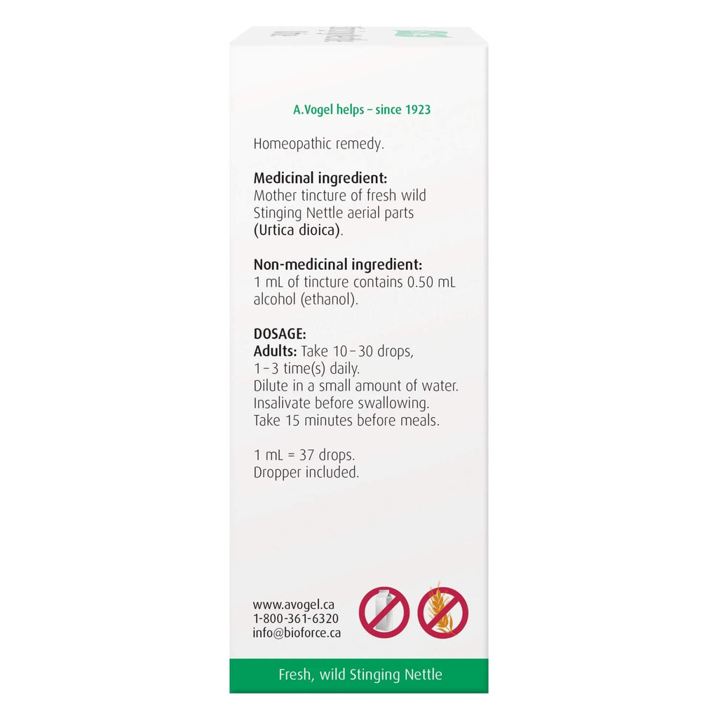 Medicinal Ingredients: Mother tincture of fresh wild Stinging Nettle aerial parts (Urtica dioica).