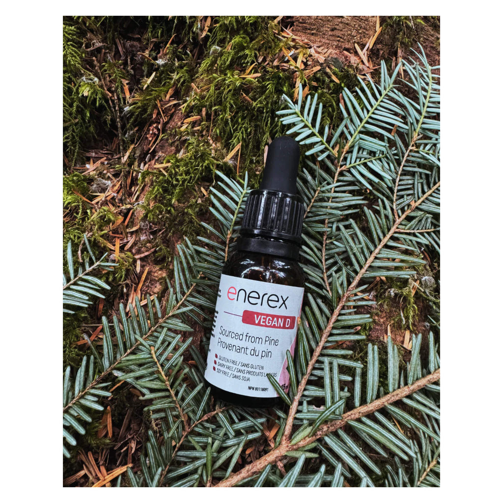 Enerex Vegan D3 is a clean, plant-based vitamin D3 supplement formulated to support immune system strength, bone health, mood, and overall vitality. Designed for those seeking a highly absorbable, clean ethical alternative to animal - derived D3, this formula delivers 2,500 IU of bioavailable cholecalciferol per drop - sourced entirely from sustainably harvested pine, not from lanolin or fatty fish.