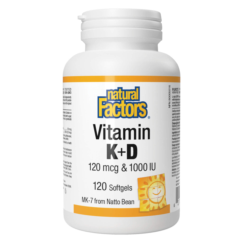 Natural Factors Vitamin K+D features vitamin K2 as menaquinone-7 (MK-7), an advanced, fat-soluble form of vitamin K that serves multiple functions in the body. Vitamin K2 plays a critical role in protecting the heart as well as building strong bones. As a director of calcium, vitamin K2 guides the mineral toward tissues where it is needed, such as bones, and away from tissues where it could have a negative effect, such as arteries. The highly bioavailable MK-7 from natto beans is the only form of vitamin K2 that offers 24-hour protection in a single daily dose. Other commercially available subtypes of vitamin K2, such as MK-4, only last 4–6 hours in the body and are required in much larger dosages to be effective.